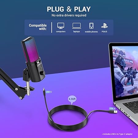 • 🎤【Plug and Play】M160 RGB gaming microphone, no need to download any additional drivers, just connect to PC, laptop, MacBook, PS4/5, tablet and mobile phone via the included USB data cable (USB A to Type-C adapter required – included). The 2-meter USB cable is long enough to extend from the back of the console to the desktop for clear game singing recording.