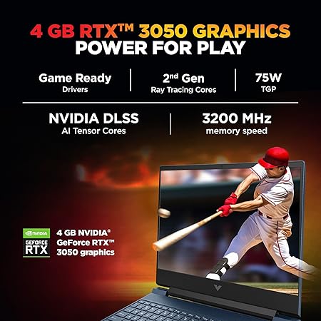 - Display & Graphics: 39.6 cm (15.6″) diagonal, FHD (1920 x 1080), 144 Hz, IPS, micro-edge, anti-glare, 300 nits, 62.5% sRGB| Graphics: NVIDIA GeForce RTX 3050 Laptop GPU (4 GB GDDR6 dedicated)