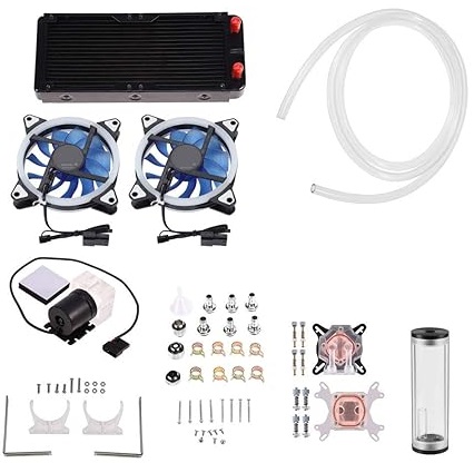• 【Professional Liquid CPU Cooler Kit】Provides a 240mm heat sink, Water Pump with Shock Pad, Cylindrical Water Reservoir, Dual Fans, CPU / GPU Blocks,Transparent Hose, well as installation accessories.